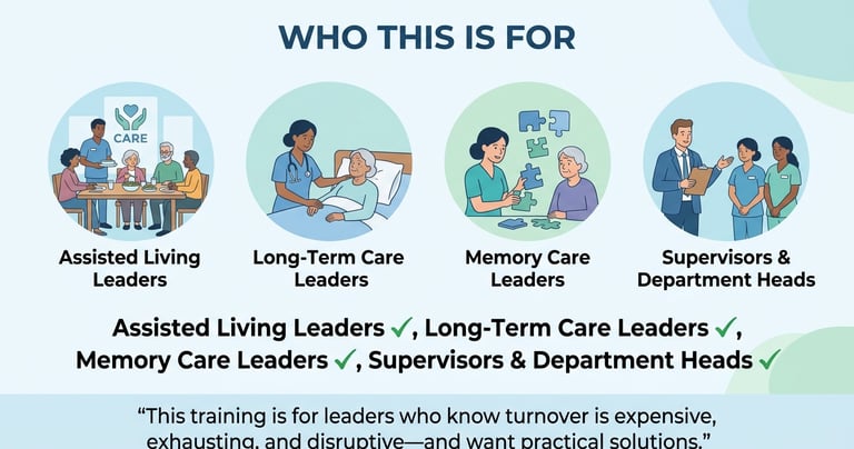 Built for assisted living, long-term care, and memory care leaders who are tired of turnover, morale problems, and workplace tension—and want tools their teams will actually use.