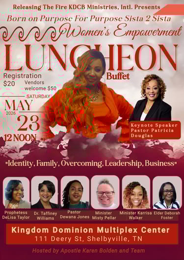 Join us in our Born on Purpose For Purpose Sista 2 Sista Women’s Empowerment Luncheon! Enjoy a full buffet as we present to some and introduce to others some of the most Powerful Woman of God in the Region!!! Luncheon registration is $20! We have 5 vendors spaces available $50. Click the links below to register. Limited seating! We will address real life topics on Healing, Identity, Family, Overcoming, Leadership, Business, etc